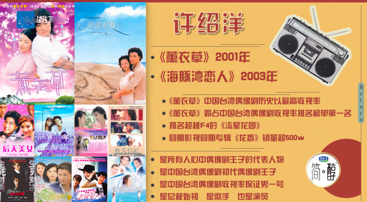 自我介绍播放PPT,他的标签都是他过去的辉煌,比如他出演的第一部作品《薰衣草》是湾湾第一部偶像剧,该剧创台偶历史上最高收视率,排名超越《流星花园》,他也因此被称为初代偶像剧王子,是台偶收视率保证的男一号,是总裁始祖。